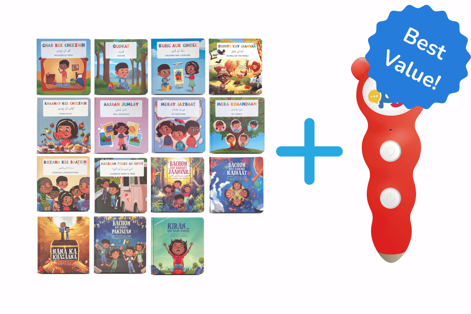 Get all 15 of our Roman Urdu books across vocabulary, conversation, and stories - along with the Bolo Pen that makes every book talk!